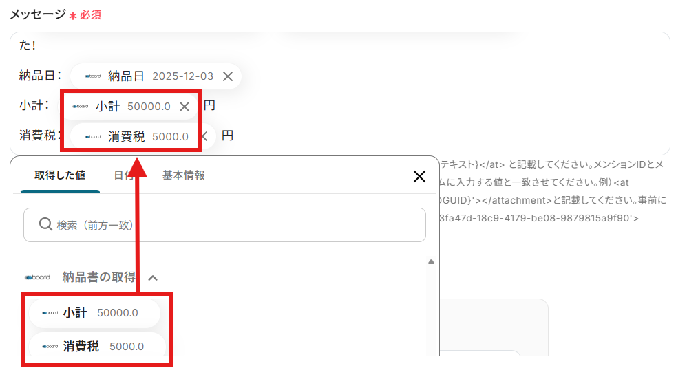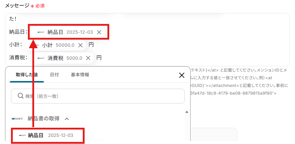 - 次に、boardの「納品書の取得」アクションを設定し、対象案件の納品書情報を取得します。
