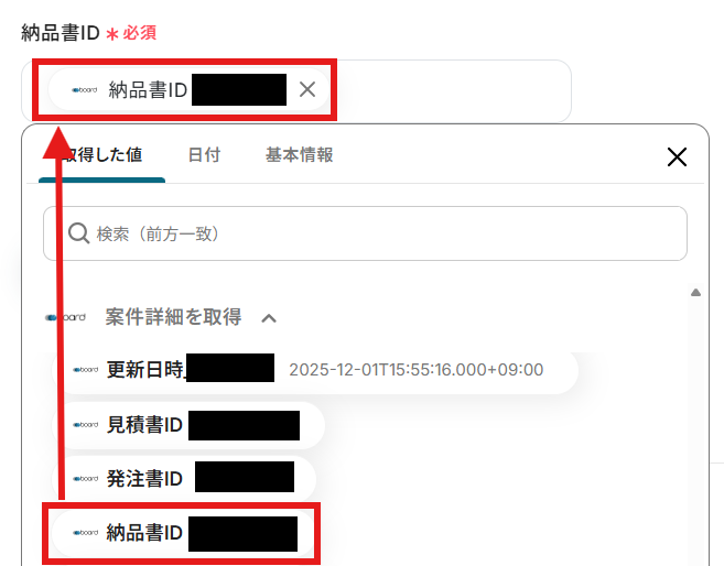 「納品書ID」を「取得した値」から設定します。