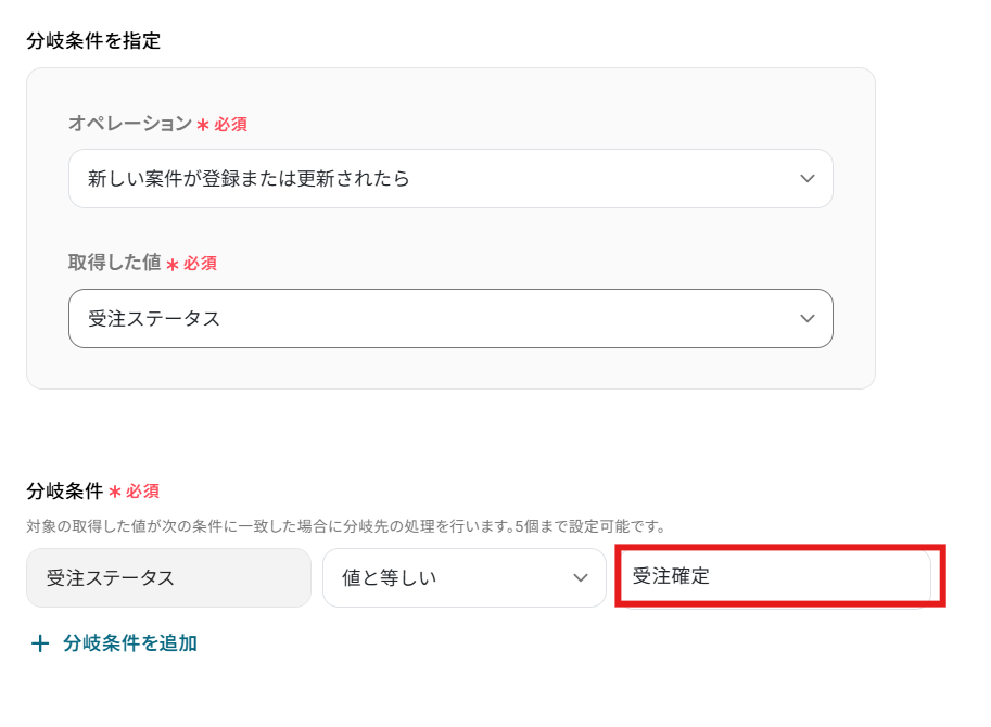 - 次に、オペレーションで分岐機能を設定し、案件のステータスが「受注」になった場合のみ、後続の処理が実行されるように条件を指定します。