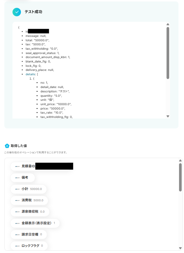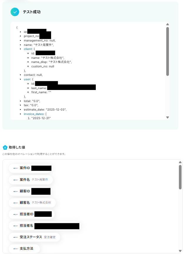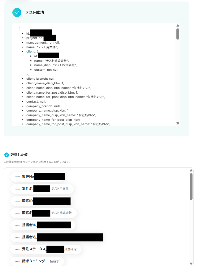 テストに成功すると「取得した値」に反映されます。詳しくは以下をご覧ください。