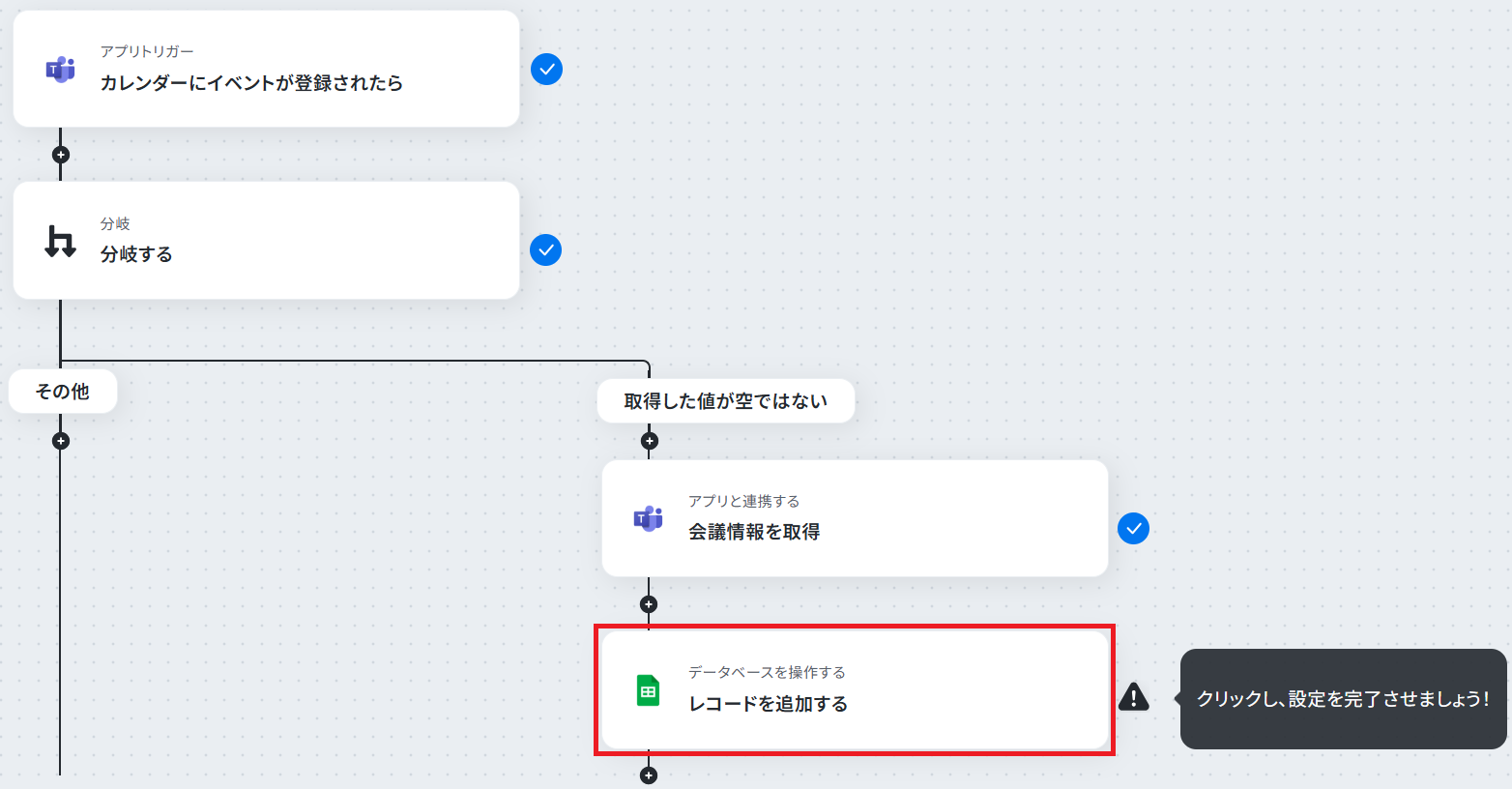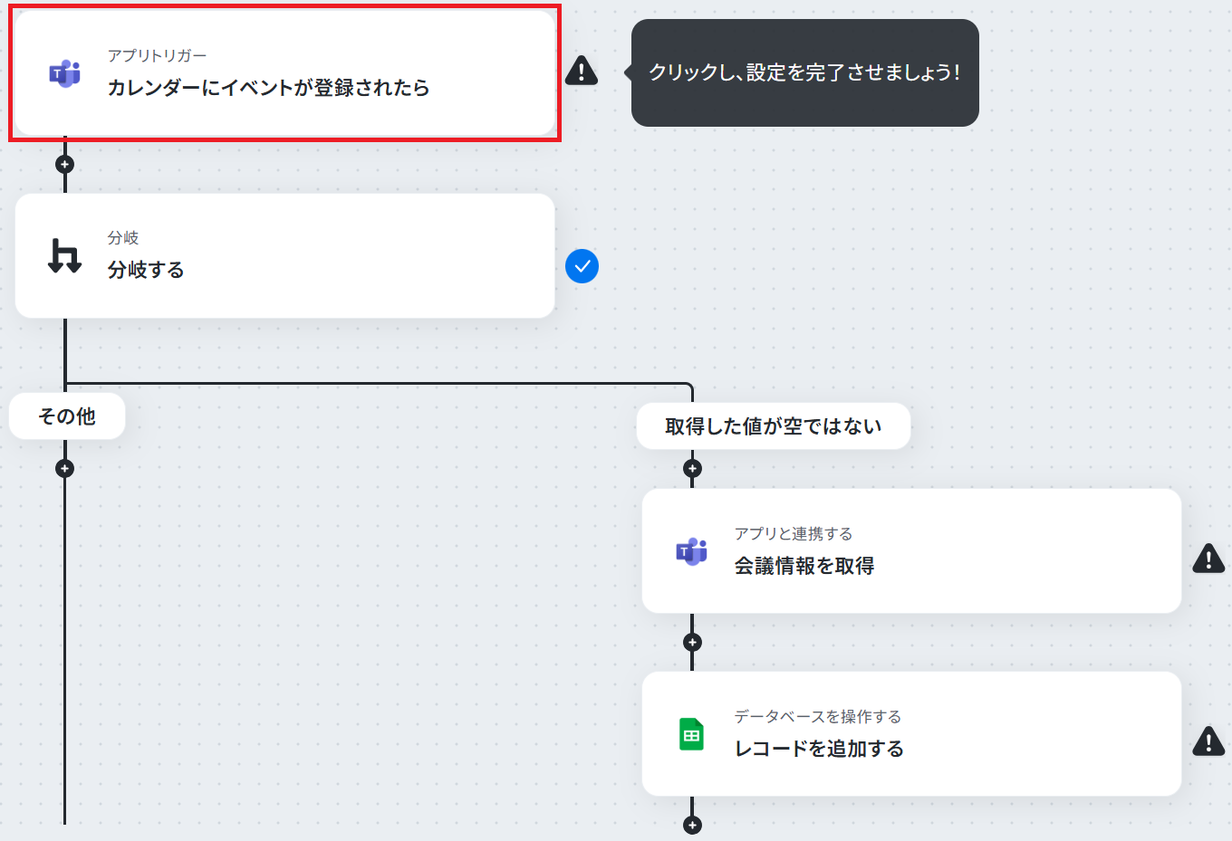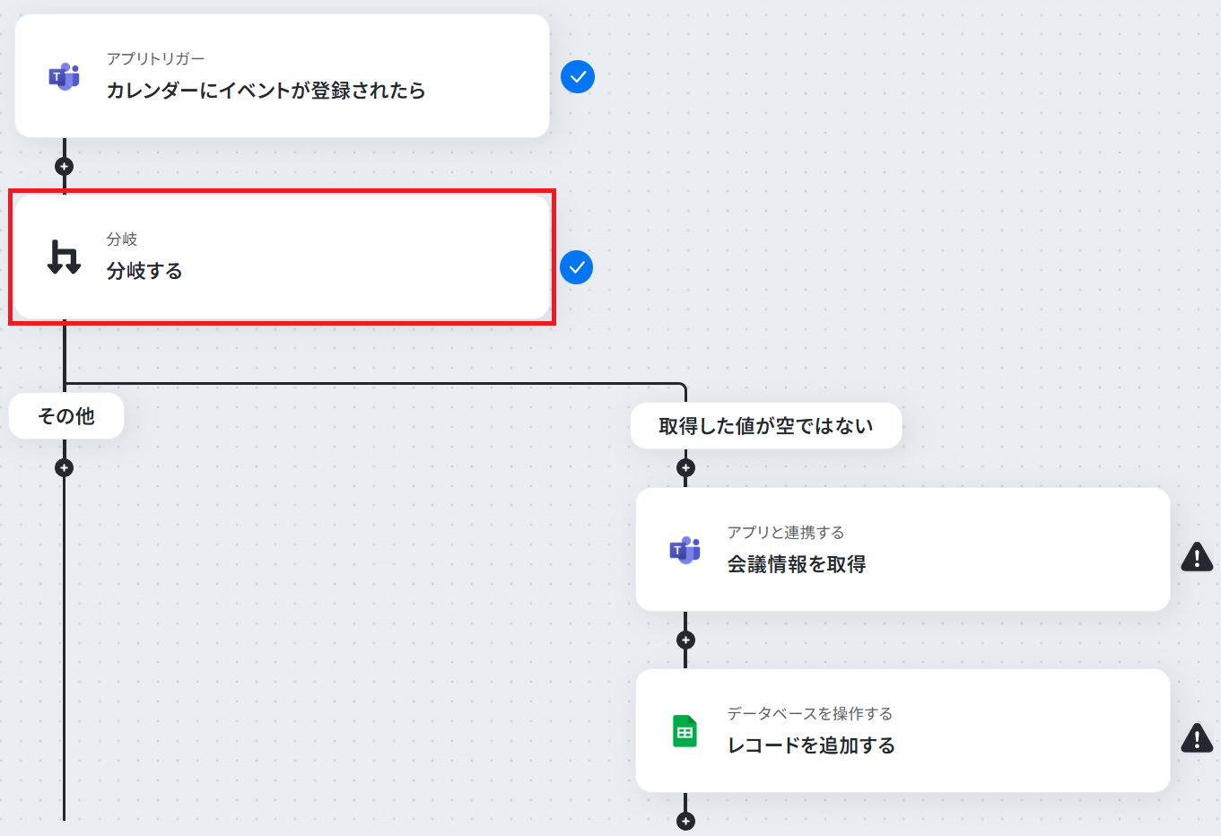 Microsoft Teamsのトリガー設定では、特定のユーザーIDを指定することで、そのユーザーのカレンダーのみを監視対象にすることが可能です。 分岐機能では、取得した会議の件名や参加者情報などをもとに、「特定のキーワードを含む会議のみ処理する」といった条件を自由に設定できます。 Google スプレッドシートへの追加アクションでは、書き込み対象のスプレッドシートIDやシート名、情報を追加するカラムなどを任意で指定してください。