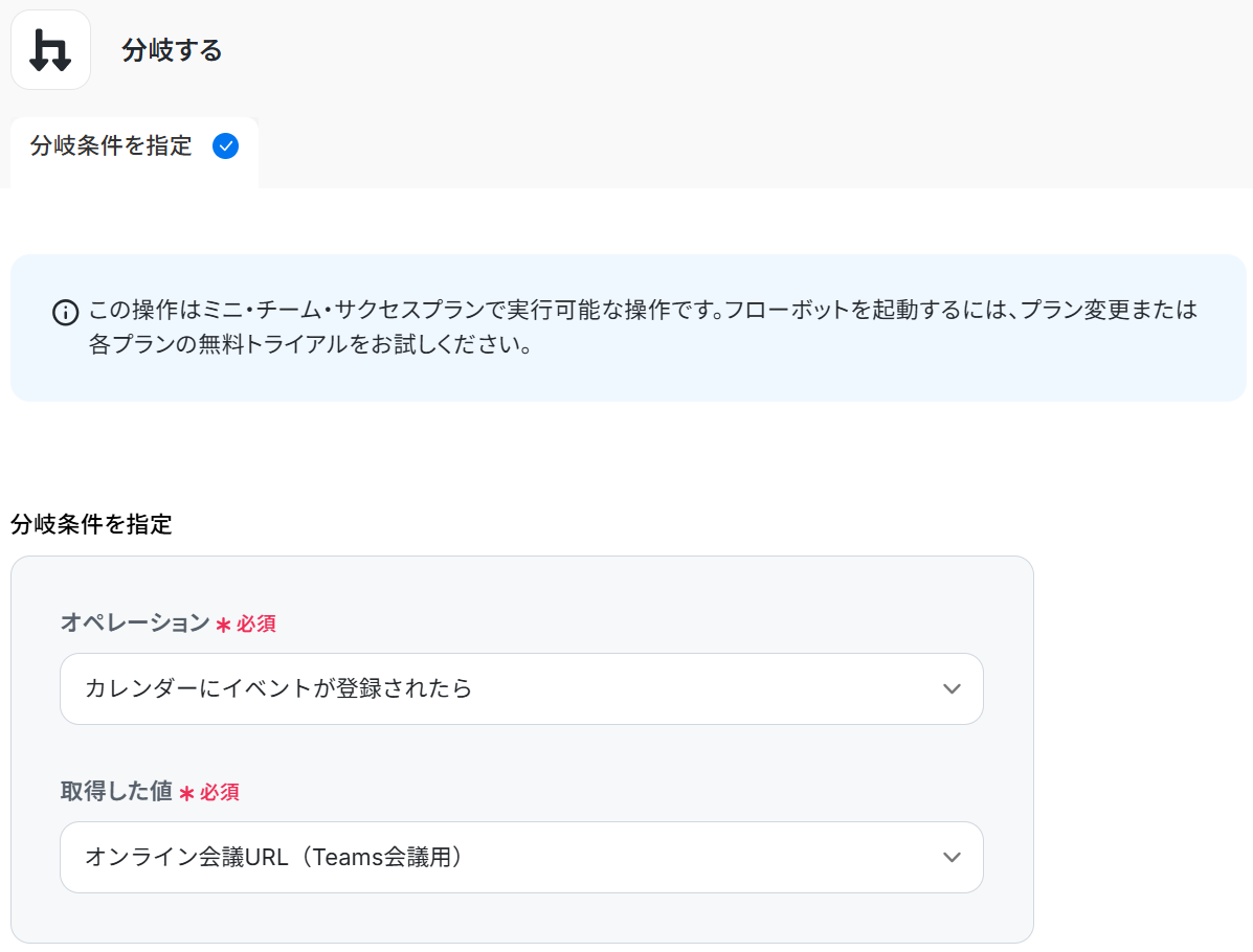 ※分岐はミニプラン 以上のプランでご利用いただける機能(オペレーション)です。フリープラン の場合は設定しているフローボットのオペレーションがエラーになるので注意しましょう。