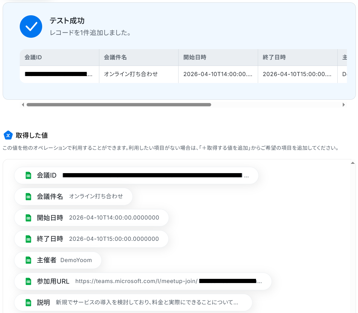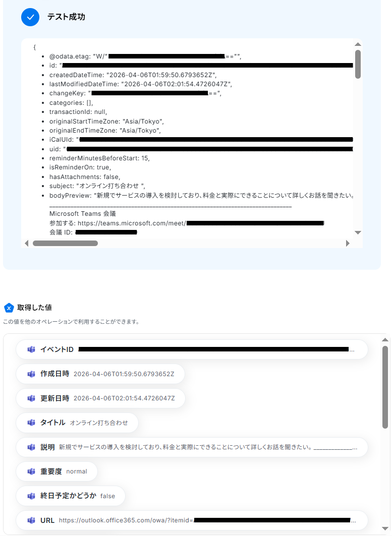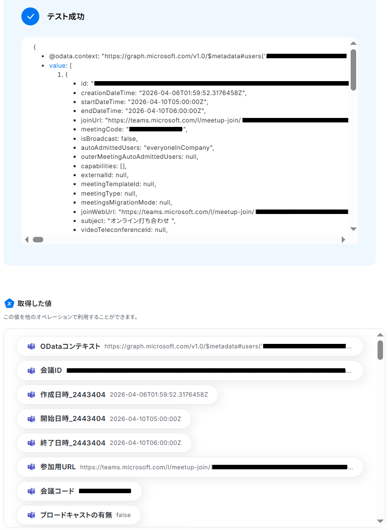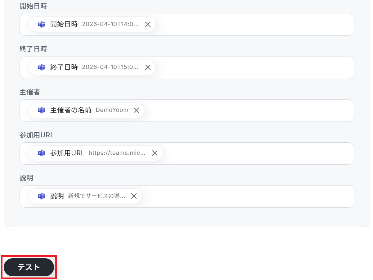 参加URL の欄には、トリガーで取得した「オンライン会議URL(Teams会議用)」の値が予め設定されているのでそのままテストしましょう。