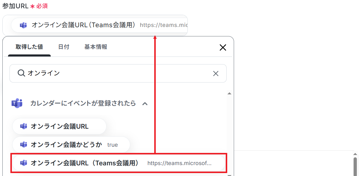 ステップ5:Microsoft Teamsのアクション設定 トリガーで取得したオンライン会議URLをもとに、会議の詳細情報を取得します。 「会議情報を取得」をクリックしましょう。