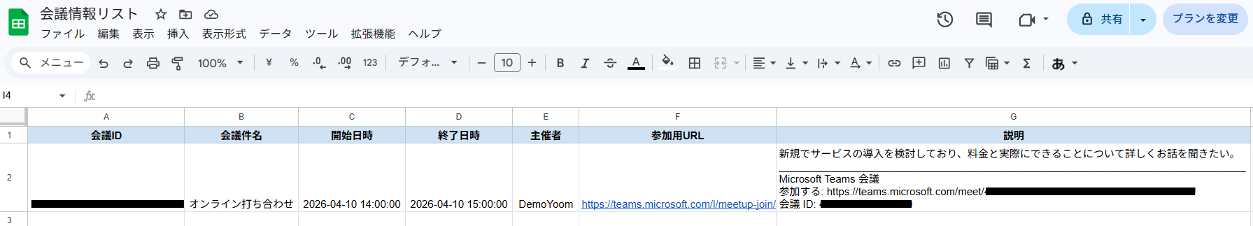 以上が、Microsoft Teamsで会議の予定が作成されたら、会議の詳細情報を取得しGoogle スプレッドシートに追加する方法 でした!