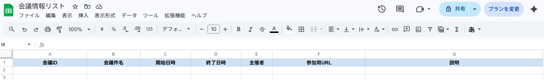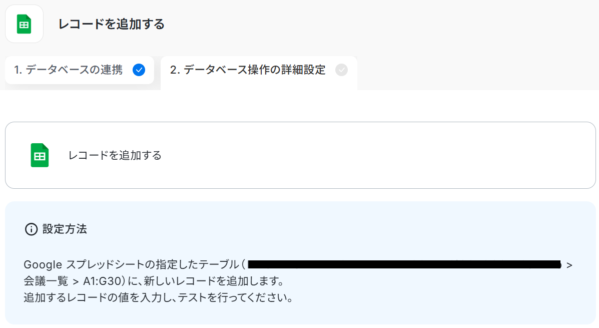 ステップ6:Google スプレッドシートのアクション設定 先ほど取得した会議の詳細情報を、Google スプレッドシートに自動で記録する設定をします。 準備として、記録するためのシートを用意しましょう。以下の2記事もご参照ください。