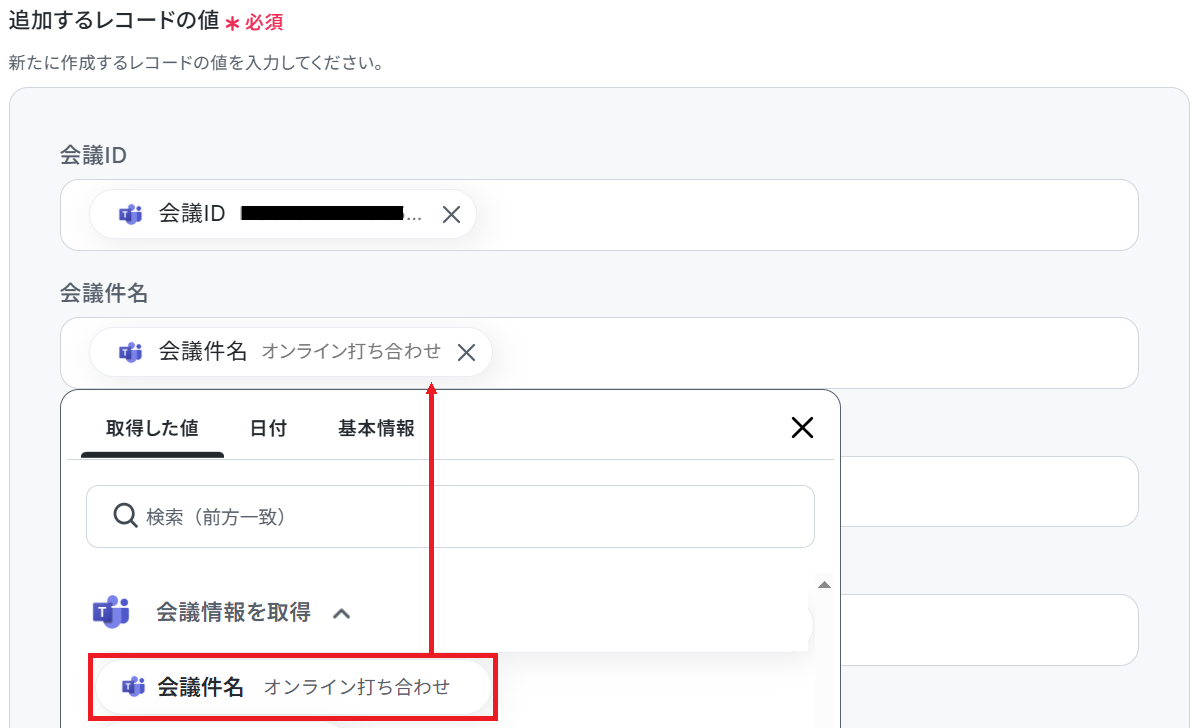 あとは先ほど用意したシートのヘッダーに対応する項目を選択してください。ステップ3・5のMicrosoft Teamsから取得した値を選択すると、会議情報を変数として反映できます。
