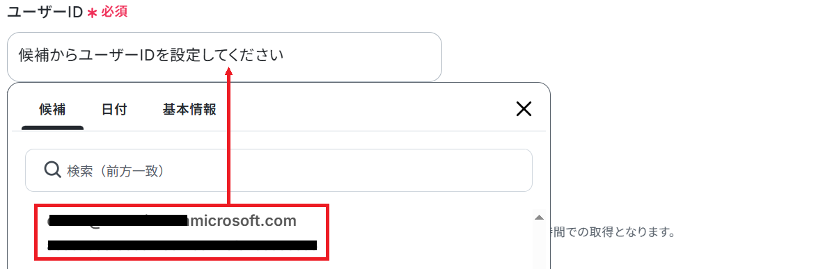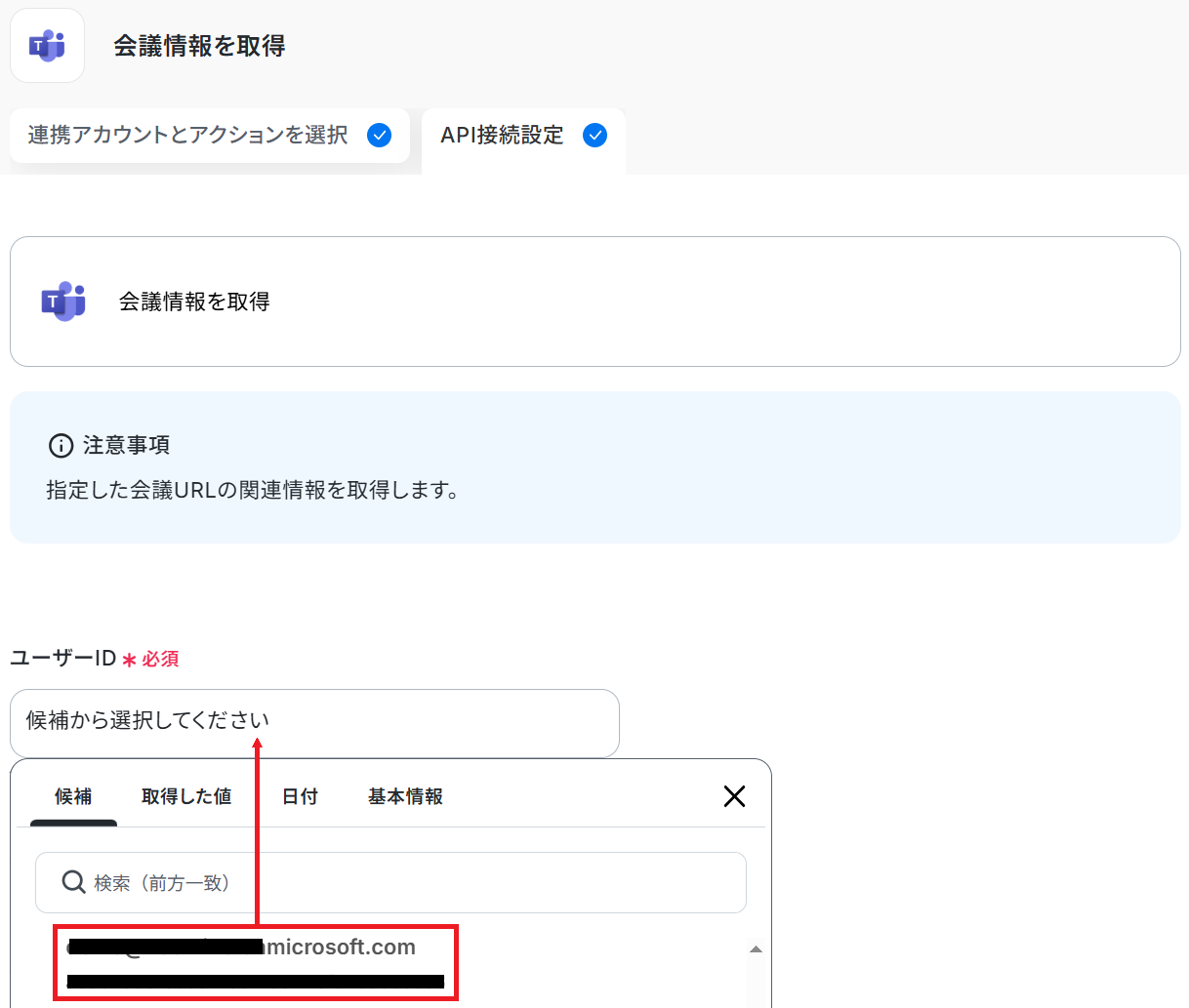次に、先ほど会議を作成したユーザーのユーザーID を候補から選択しましょう。