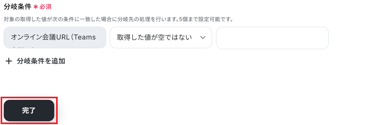 条件は「+ 分岐条件を追加」から最大5個まで設定できます。 設定が完了したら保存してください。