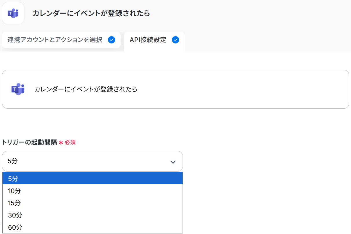 ・トリガーは5分、10分、15分、30分、60分の間隔で起動間隔を選択できます。