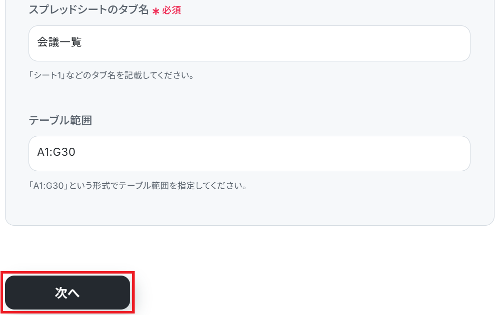同様にスプレッドシートのタブ名 も選択し、任意でテーブル範囲 を入力して「次へ」をクリックします。