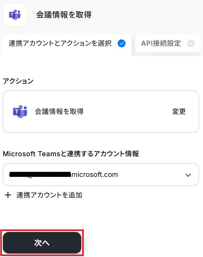 ステップ3と同様、アクションは「会議情報を取得」のまま「次へ」をクリックします。