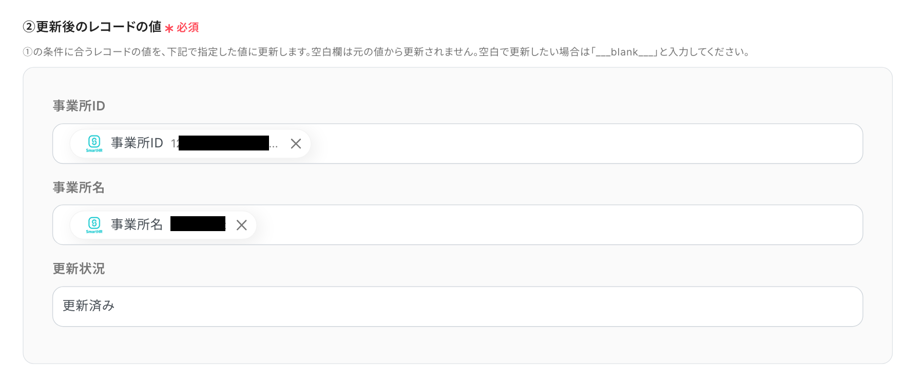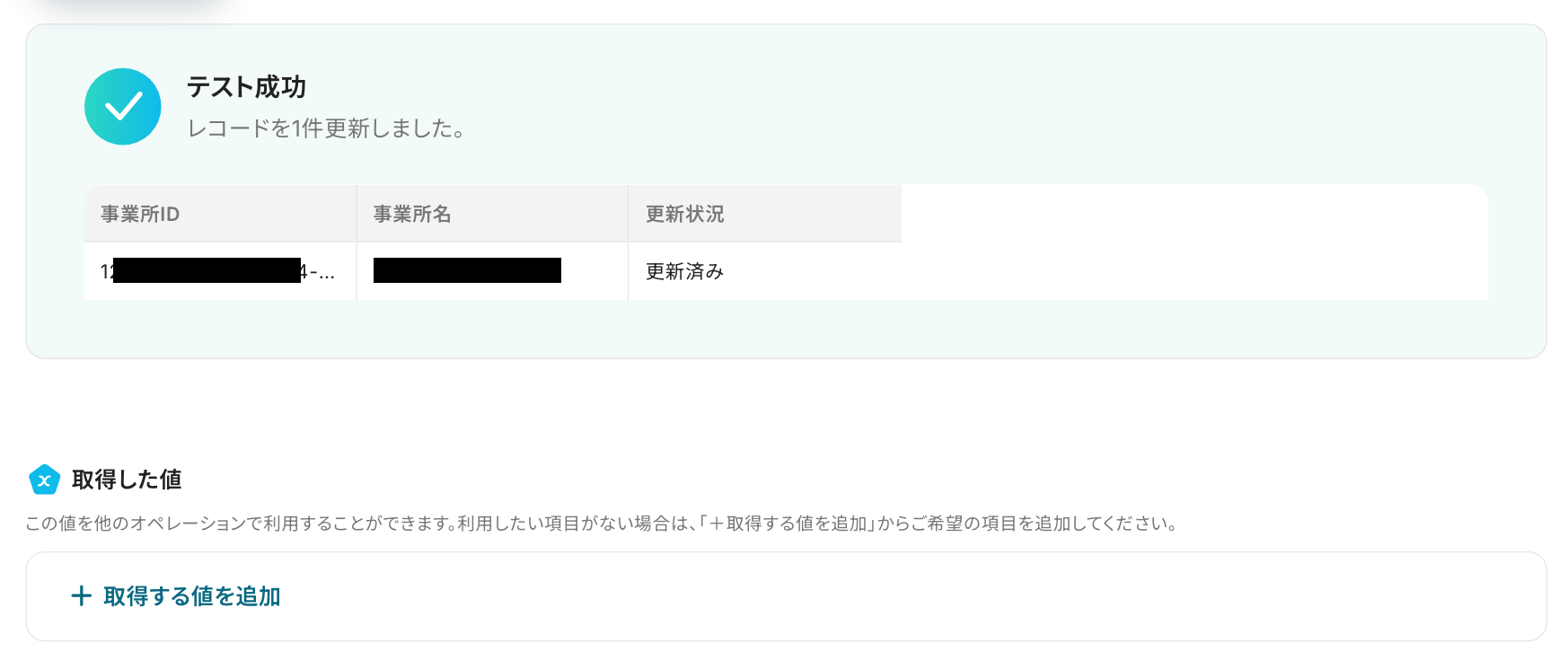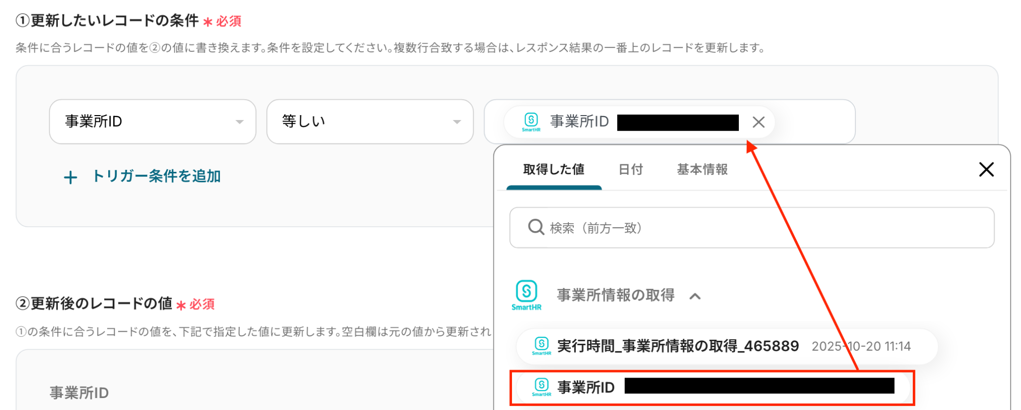 今回は、事業所IDが更新先シートの「事業所ID」に指定した「事業所ID」が入力されていたら、レコードを更新するように設定しました。