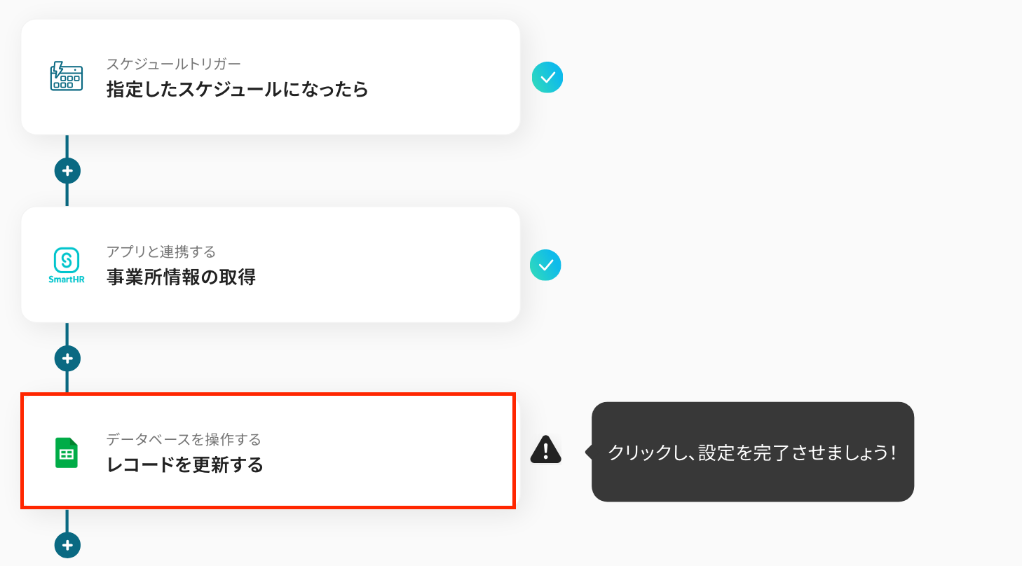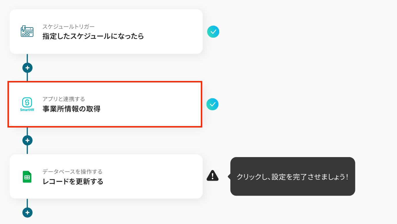 それではここから代表的な例として、SmartHRの事業所情報を定期的に取得し、Google スプレッドシートに自動で同期するフローを解説していきます!