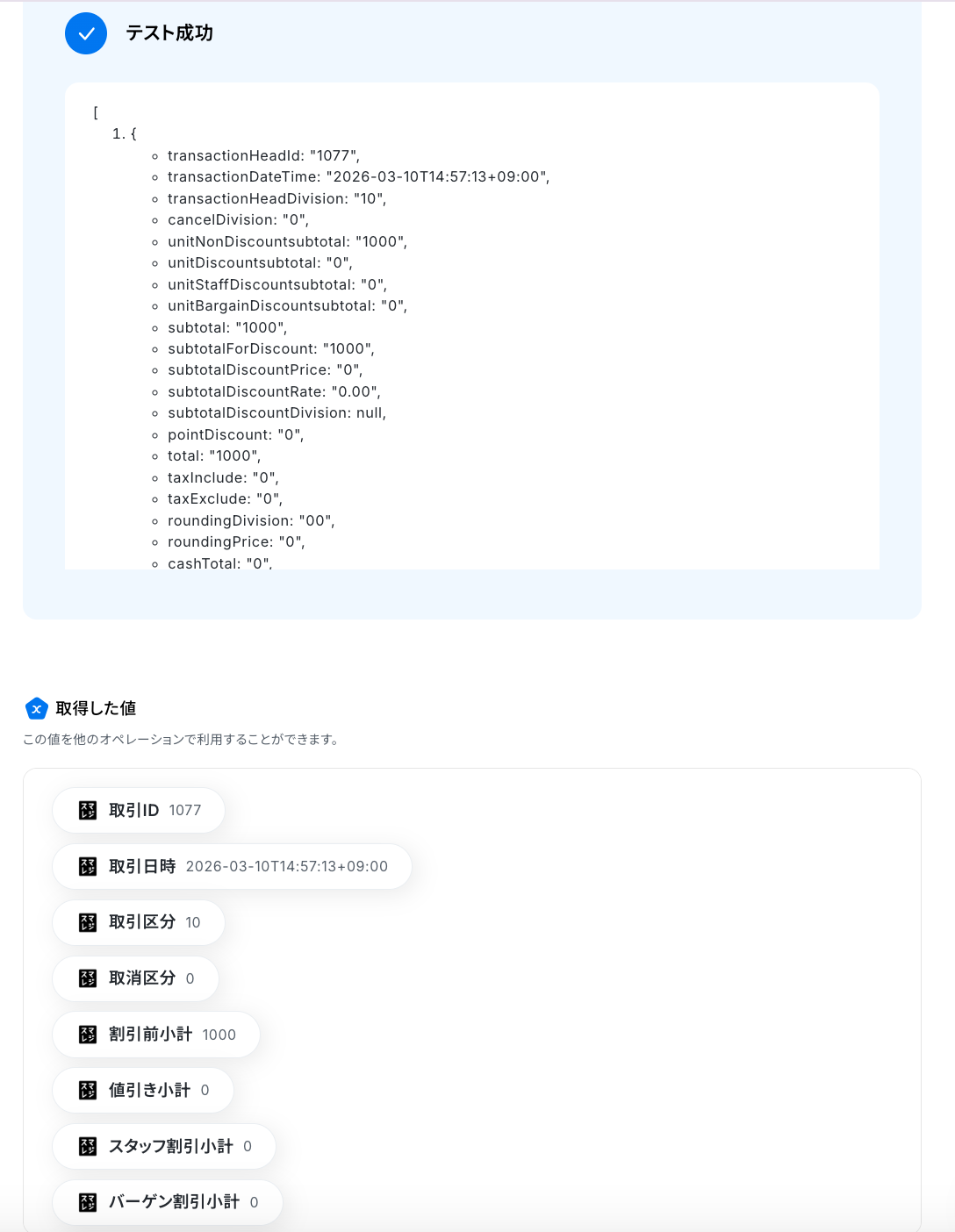 ※ 取得した値 とは? トリガーやオペレーション設定時に、「テスト」を実行して取得した値のことを指します。後続のオペレーション設定時の値として利用でき、フローボットを起動する度に変動した値となります。