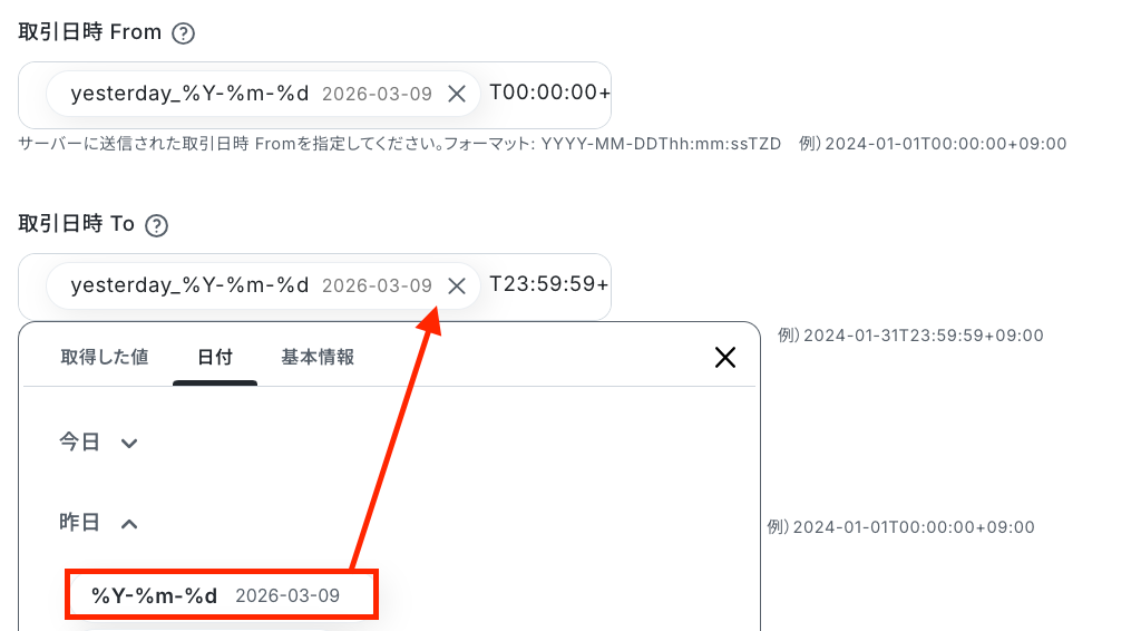 次に、取引日時(From)(To)、端末取引日時(From)(To)、締め日(From)(To)、更新日時(From)(To)のうち1つ以上を必ず指定します。 ここでは、取引日時を指定しています。 日付変数を使用して、設定しましょう!