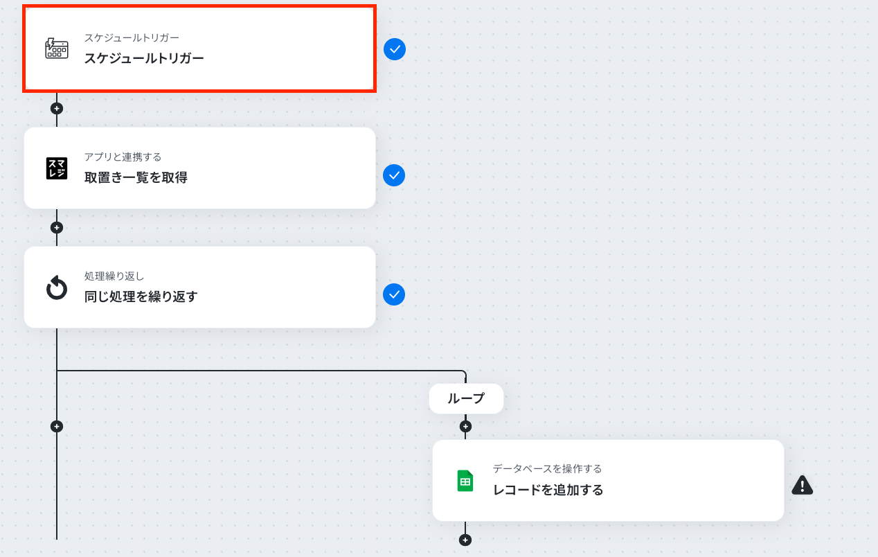 スケジュールトリガーでは、毎日や毎週、特定の日時など、このフローを起動したい任意の時間帯や頻度を設定してください。 スマレジから取置き一覧を取得する際には、取得対象の日付だけでなく、店舗IDなどを指定して特定の店舗の情報のみを取得することも可能です。 Google スプレッドシートにレコードを追加する際には、保存先のファイルやシート、またスマレジから取得したどの情報をどの列に書き込むかなどを任意で設定してください。 ■注意事項
