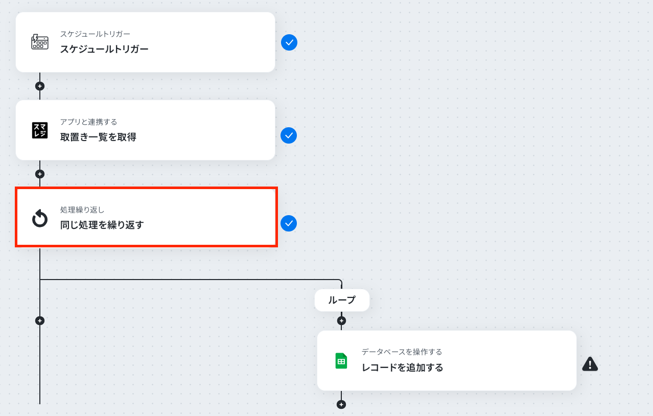 ※「同じ処理を繰り返す」オペレーション間の操作は、チームプラン・サクセスプランでのみご利用いただける機能となっております。フリープラン・ミニプランの場合は設定しているフローボットのオペレーションやデータコネクトはエラーとなりますので、ご注意ください。