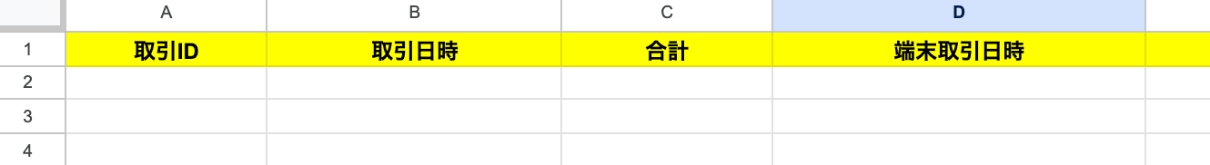 テーブル範囲は、ヘッダーがテーブル範囲内に含まれるように設定しましょう。 以下のシートを使用するため「A1:D」と設定しました。 今回は、繰り返し処理のオペレーションで設定した取得した値を入力するため、以下のシートを準備しました。
