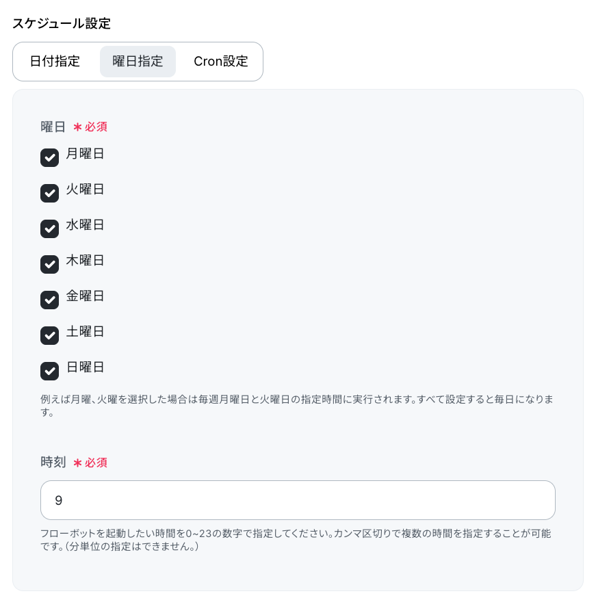 「スケジュール設定」では、フローボットを起動したい日付や時刻を設定します。 今回は以下の設定にしましたが、自由に設定してOKです。 設定を終えたら「完了」をクリックしましょう!