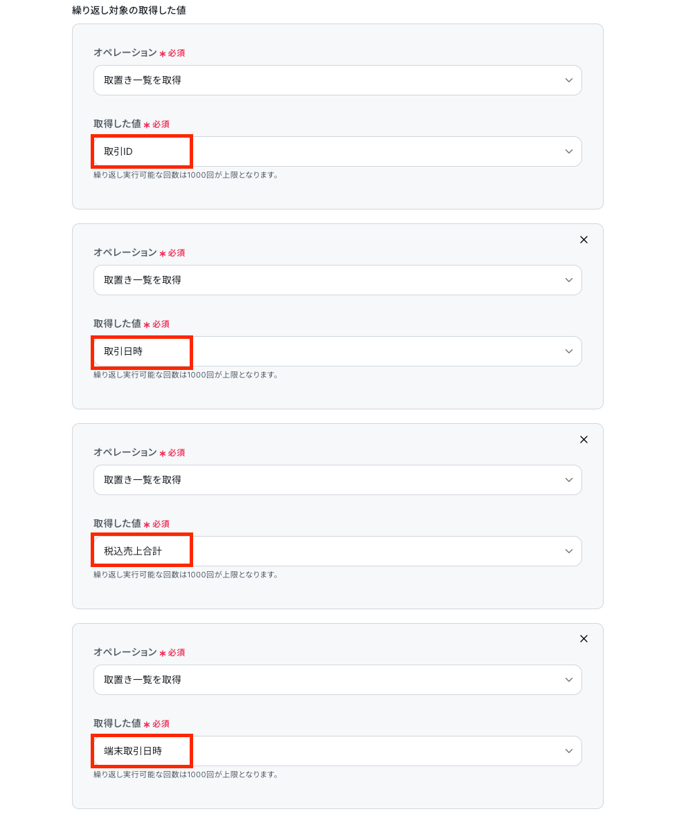 次の画面で、「繰り返し対象の取得した値」を設定します。「オペレーション」 は、「取置き一覧を取得」「取得した値」 には、先ほどのステップで取得した値から、Google スプレッドシートに追加したい項目を設定しましょう。