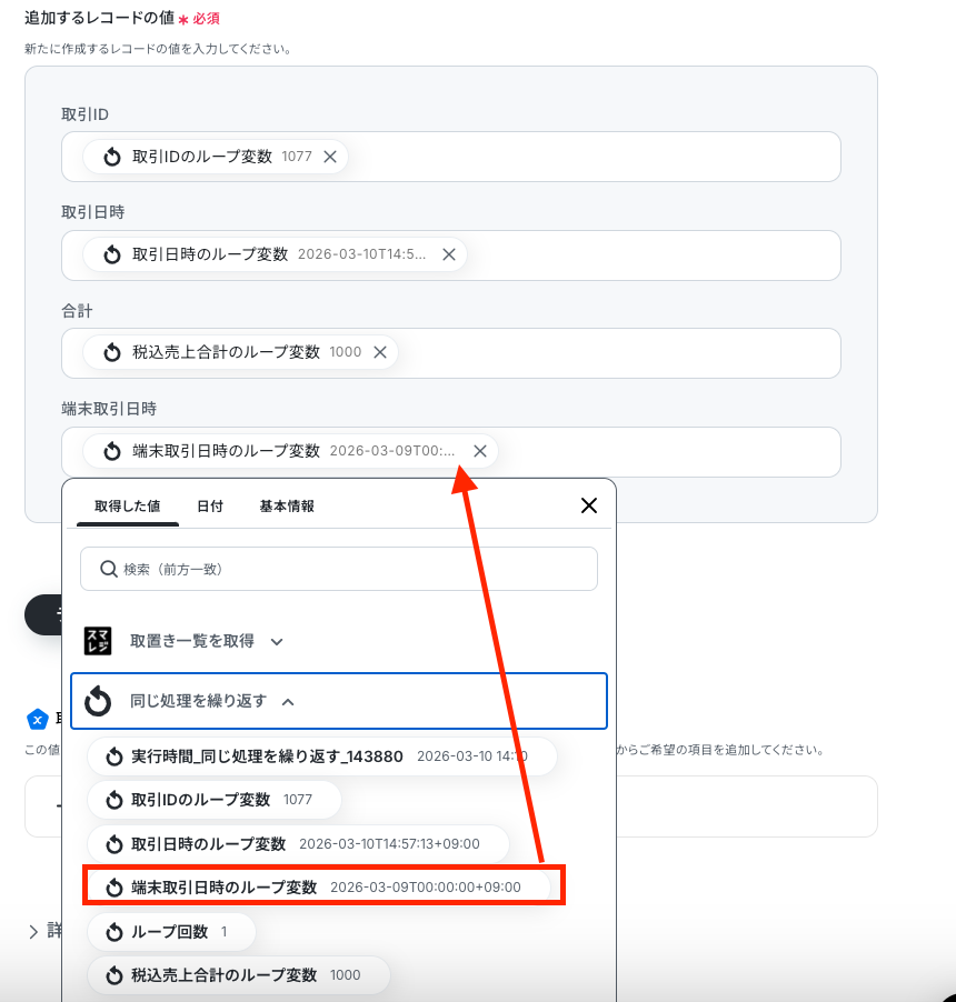 次の画面で「追加するレコードの値」 を設定します。 Google スプレッドシートの任意の列に、繰り返し処理のオペレーションで取得したループ変数を引用して設定してください。