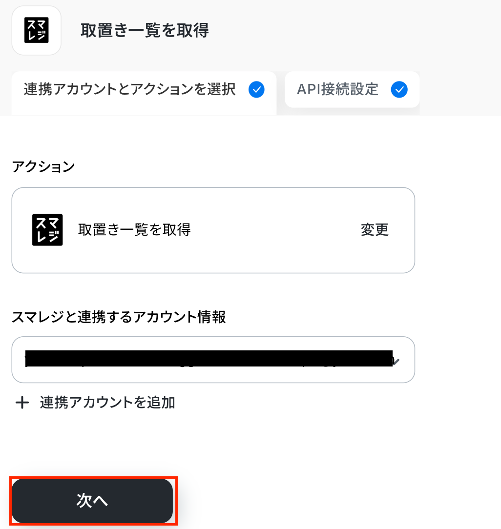 次の画面でアクションはそのままで、連携するアカウントを確認します。 確認後、「次へ」をクリックしてください。