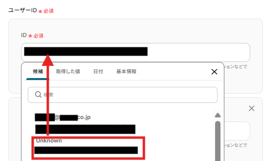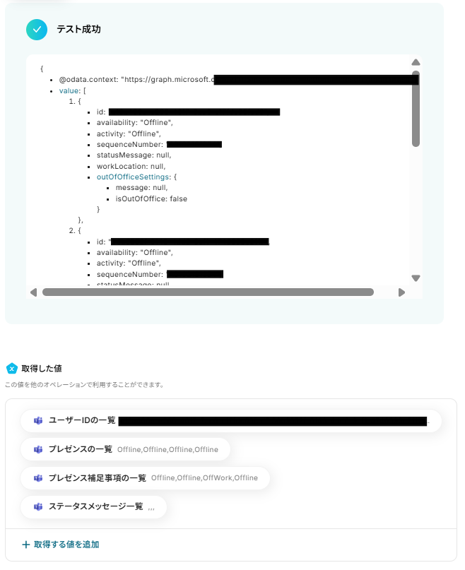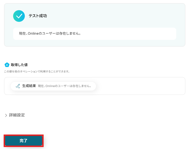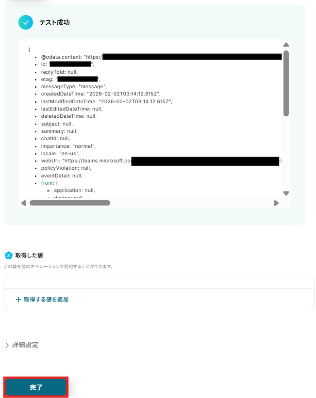 入力が完了したら、「テスト」をクリックします。 テストに成功すると、「取得した値」に情報が追加されます。 ※取得した値とは 設定時の「テスト」で取得した値のことです。後続ステップの入力値として利用でき、実行のたびに最新の内容に更新(変動)されます。 詳しくは取得した値 およびテストの重要性:「取得した値」のテスト値について をご確認ください。 取得した値の内容が確認できたら、「完了」をクリックします。