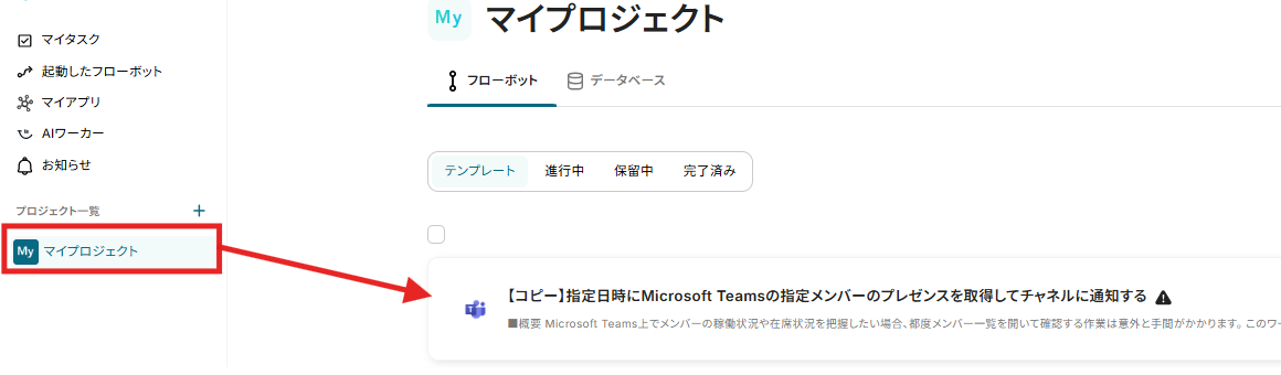 また、コピーしたテンプレートはマイプロジェクトに保存されているので、後からフローを編集したい場合などは、マイプロジェクトからも開くことができます。