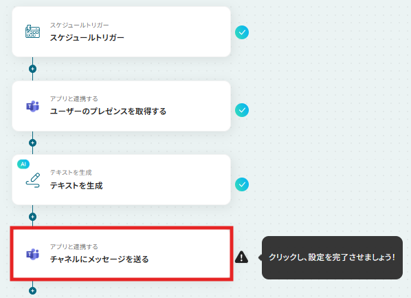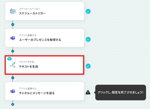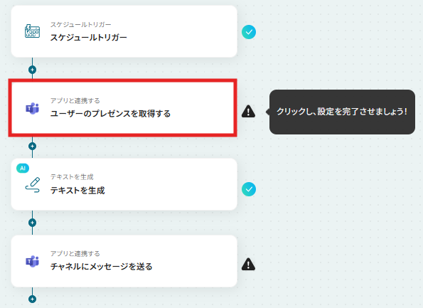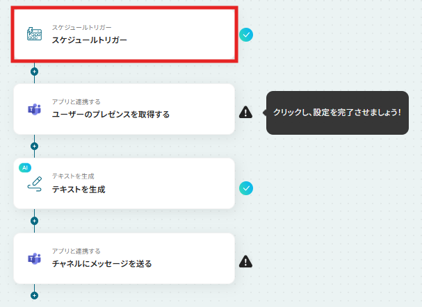 はじめに、Microsoft TeamsをYoomと連携します 次に、トリガーでスケジュールトリガーを選択し、フローを実行したい日時や間隔を設定します 次に、オペレーションでMicrosoft Teamsの「ユーザーのプレゼンスを取得する」アクションを設定し、対象メンバーを指定します 次に、取得したプレゼンス情報をもとに「テキストを生成する」アクションを設定します 最後に、オペレーションでMicrosoft Teamsの「チャネルにメッセージを送る」アクションを設定し、生成したテキストを通知します ※「トリガー」:フロー起動のきっかけとなるアクション、「オペレーション」:トリガー起動後、フロー内で処理を行うアクション■このワークフローのカスタムポイント
