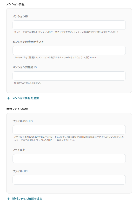 メンション情報や添付ファイルをつけることも可能です。 その場合はMicrosoft Teams でのメンション方法 やMicrosoftTeamsでファイルつきメッセージを送付する方法 を参考にこちらで設定してください。