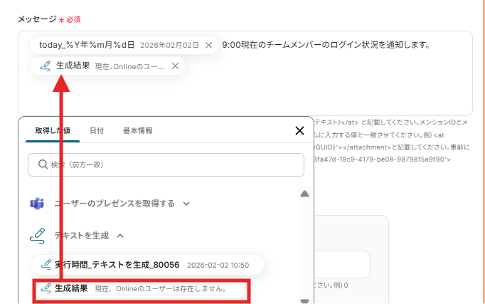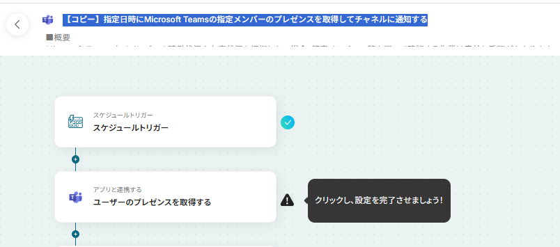 スケジュールトリガーでは、実行したい日時や曜日、間隔を業務に合わせて任意に設定してください。 プレゼンスを取得するオペレーションでは、通知対象としたいメンバーを用途に応じて選択してください。 テキスト生成のステップでは、プレゼンス情報をどのような文面で通知するか、用途に合わせて内容を調整できます。また、特定のプレゼンスのメンバーだけに限定して通知することも可能です。 ■注意事項