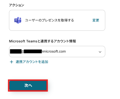 アクションは変更せず、アカウント情報がマイアプリ連携をしたアカウントと一致することを確認したら、「次へ」をクリック。