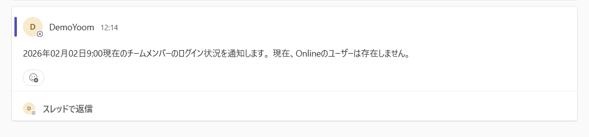 Microsoft Teams上でメンバーの稼働状況や在席状況を把握したい場合、都度メンバー一覧を開いて確認する作業は意外と手間がかかります。 このワークフローを活用すれば、あらかじめ指定した日時をきっかけに、特定のメンバーのプレゼンスを自動で取得し、その結果を分かりやすいテキストにまとめてチャネルへ通知できます。 定期的な状況確認を自動化することで、手動確認の負担を減らし、チーム全体の状況把握をスムーズに行えるようになります。