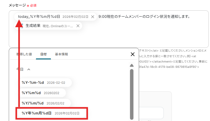 メッセージには固定値と取得した値を活用し、以下のように作成しました。