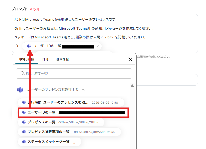 まず、プロンプトを設定してください。 今回は以下のように「固定値」と「取得した値」を組み合わせて構成しました。 取得した値を活用しているため、トリガー実行のたびに最新の情報が自動で反映されます。 実際の業務フローに合わせて、使いやすいようにカスタマイズして試してみてください!