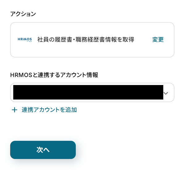 - 続いて、オペレーションでHRMOSの「社員の履歴書・職務経歴書情報を取得」アクションを設定します。