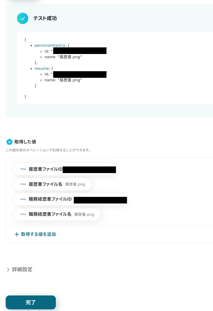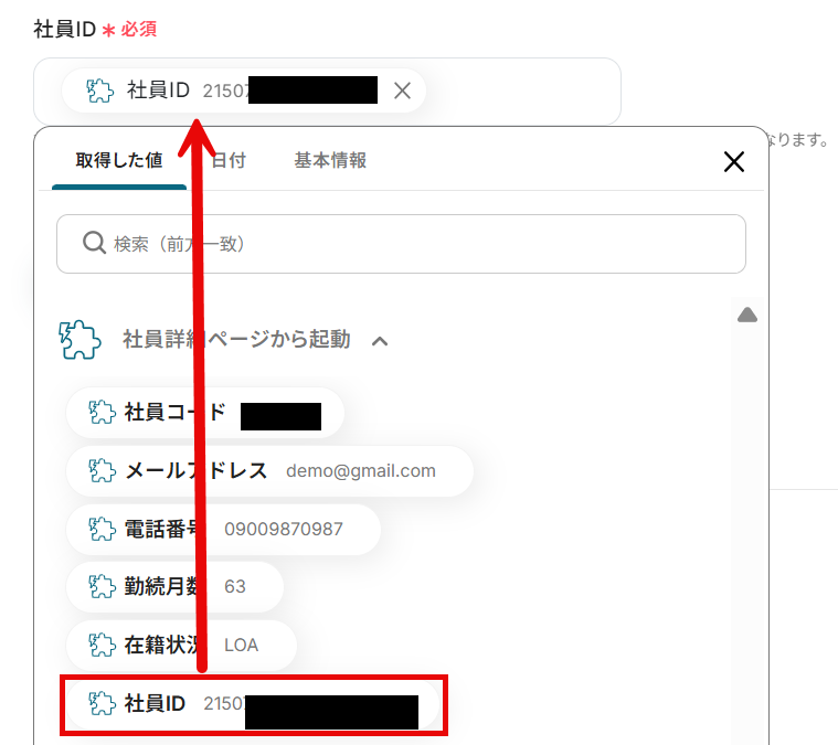 社員IDと職務経歴書ファイルIDはそれぞれ取得した値から選択しましょう。