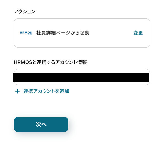 - 次に、トリガーでHRMOSを選択し、「社員詳細ページから起動」を設定します。