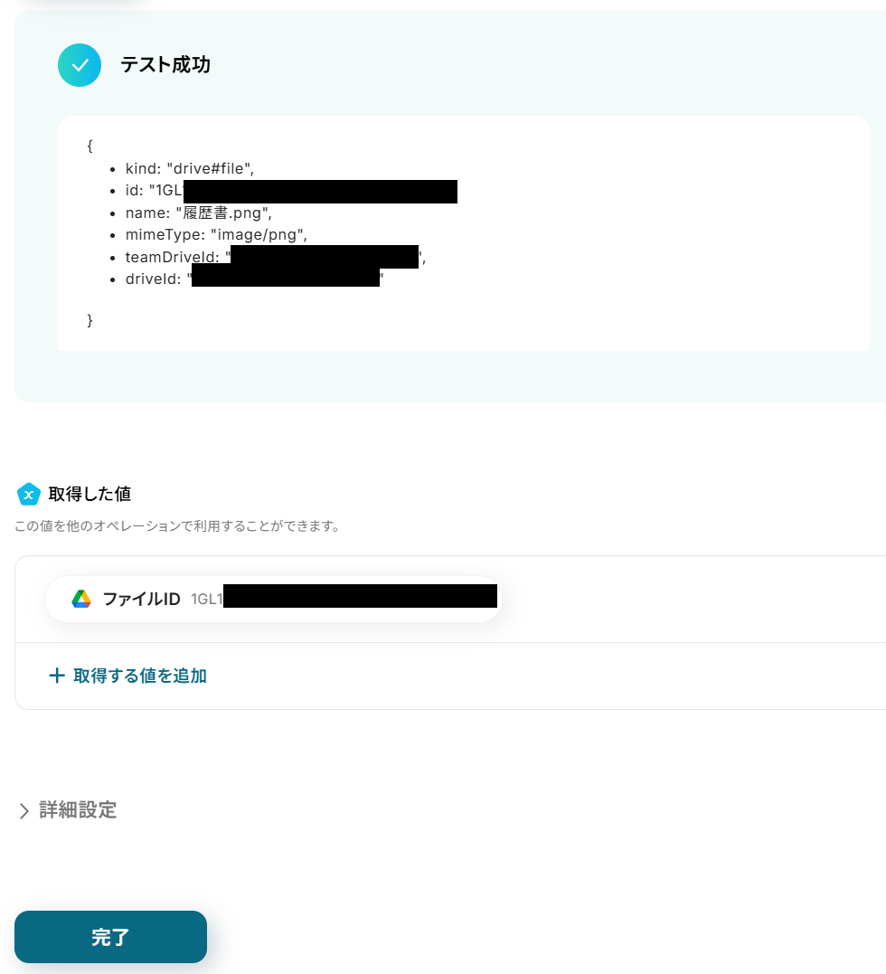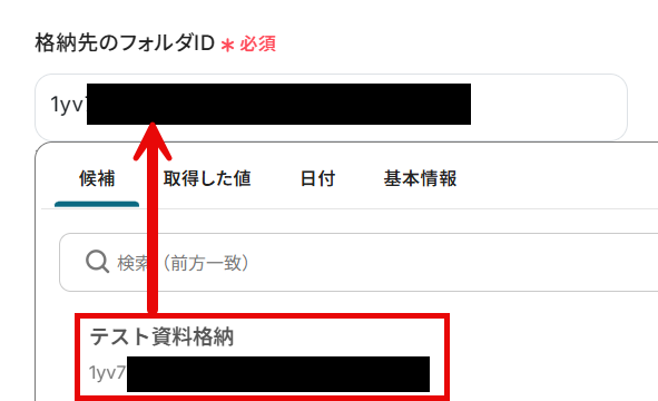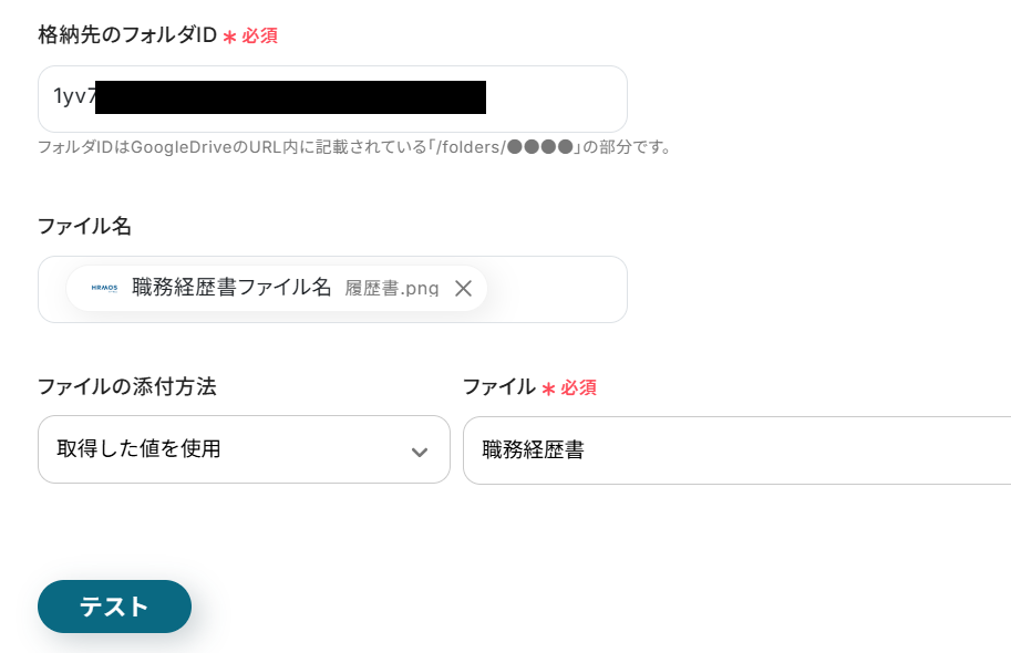 - Google Driveにファイルをアップロードする設定では、格納先のフォルダIDや、保存する際のファイル名を任意で設定してください。