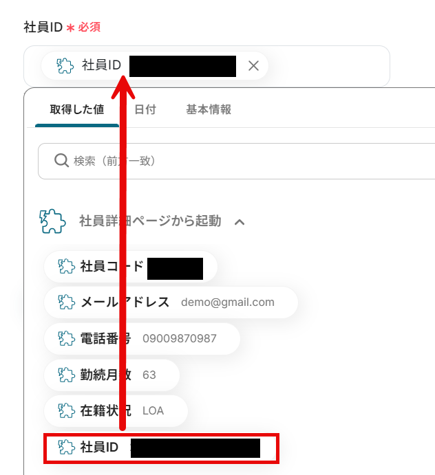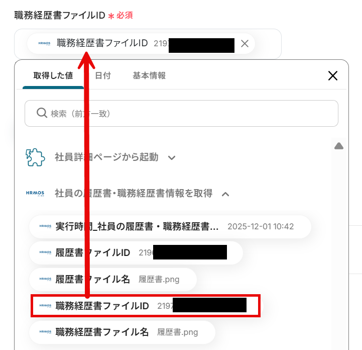 前項で取得した値から、社員の履歴書・職務経歴書を取得する設定を行いましょう。