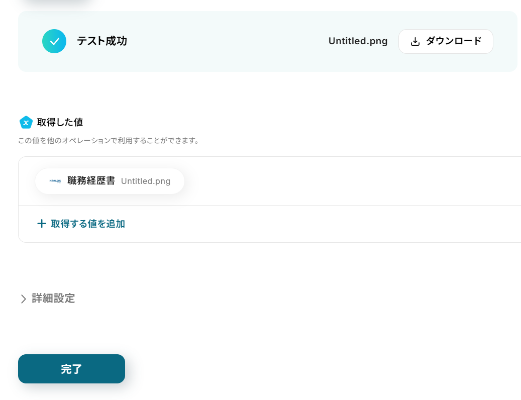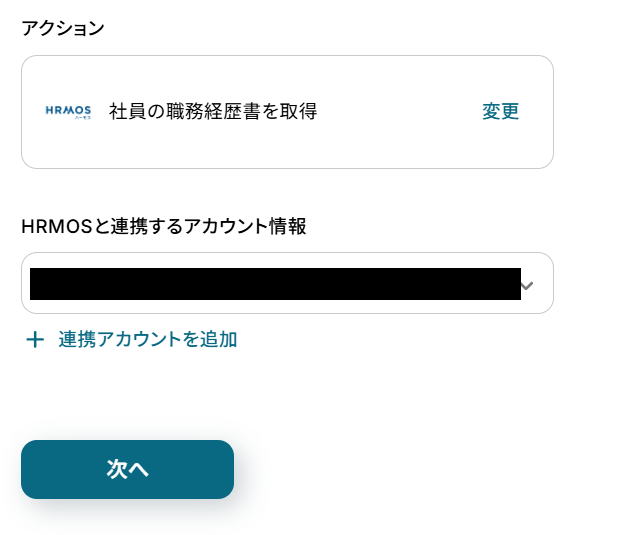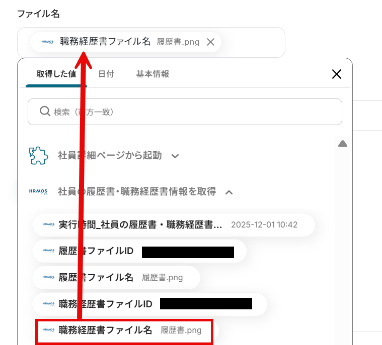 - 次に、同じくHRMOSの「社員の職務経歴書を取得」アクションを設定し、ファイルデータを取得します。
