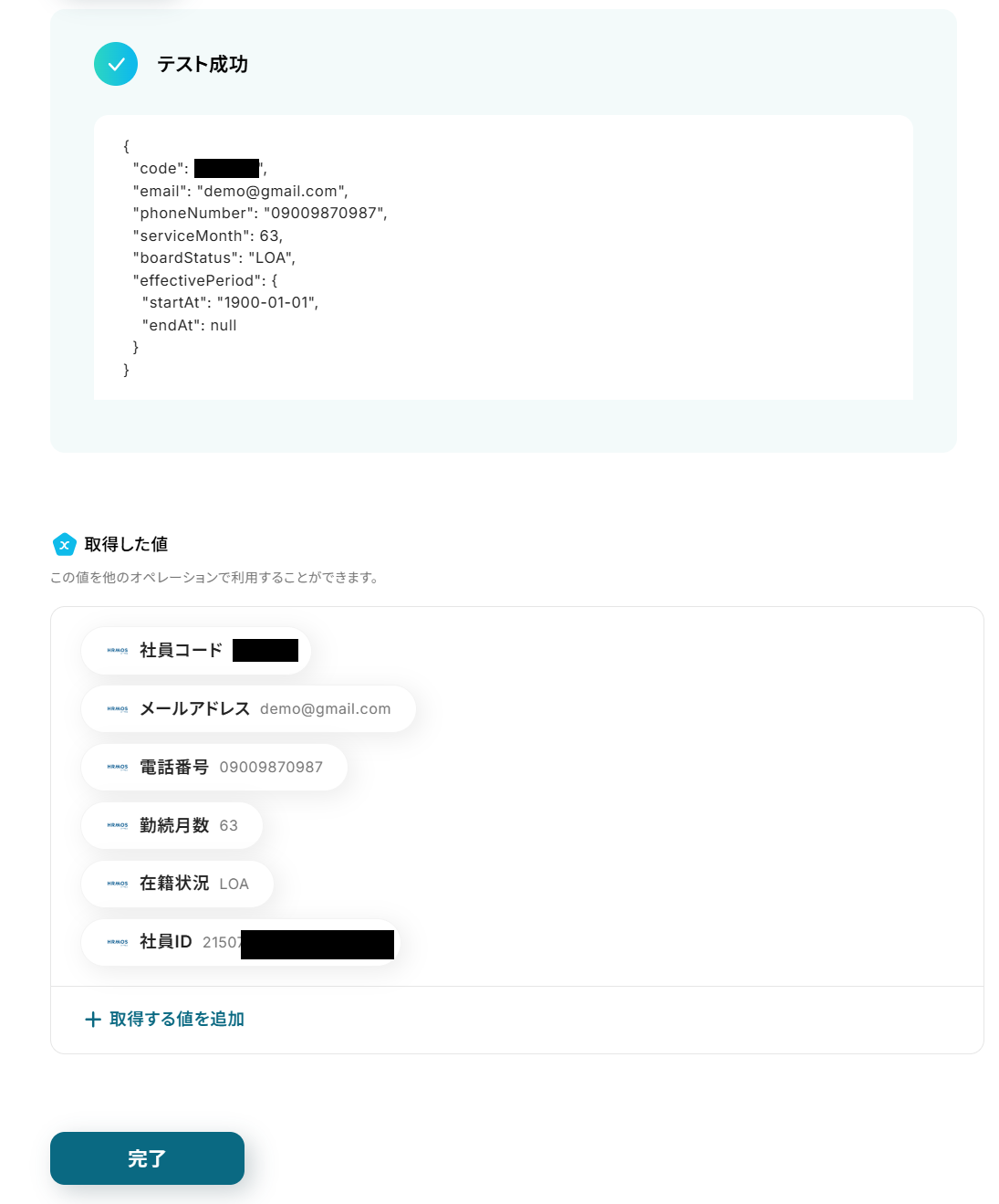 テストに成功すると、以下のように表示され、取得した値が出力されます。