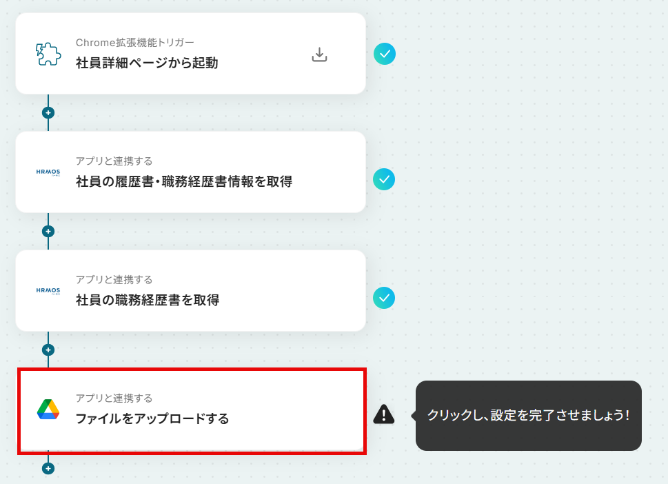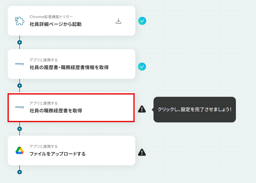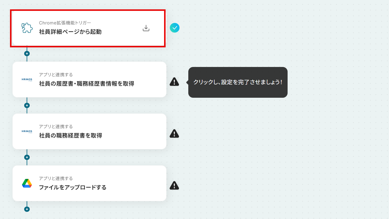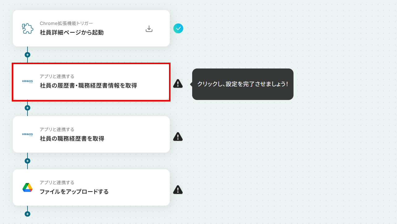 それでは例として、HRMOSに候補者情報が登録された際に、職務経歴情報を自動で取得しGoogle Driveに格納するフローを解説していきます!