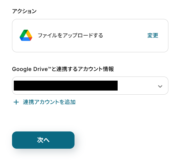 その際は、Google Driveのアクションを削除し、お使いのストレージとアプリ連携してから、「ファイルをアップロードする」アクションを追加してください。