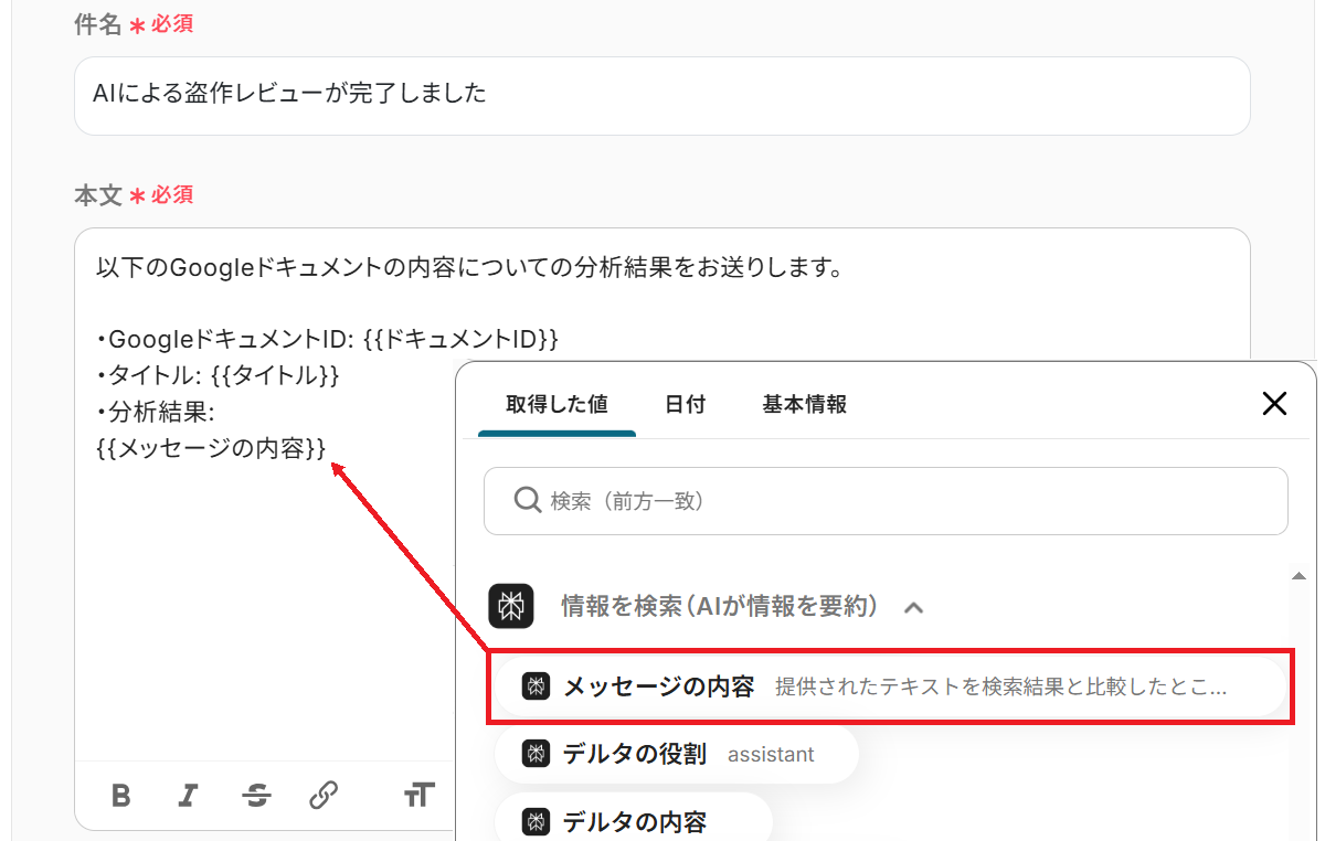 たとえば、Googleドキュメントの内容をAIで要約してメールやチャットに通知したり、別のツールに整理して記録することで、文章レビューや情報共有の効率を高めることができます。