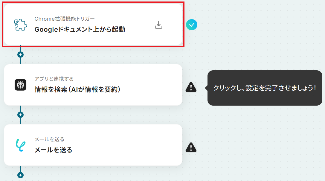 GoogleドキュメントとPerplexityのそれぞれとYoomを連携してください。 Chrome拡張機能を使ったトリガーの設定方法は「Chrome拡張機能を使ったトリガーの設定方法 」をご参照ください。 Chrome拡張機能を使用したトリガーを使用することで、Googleドキュメント上から直接トリガーを起動させることができます。