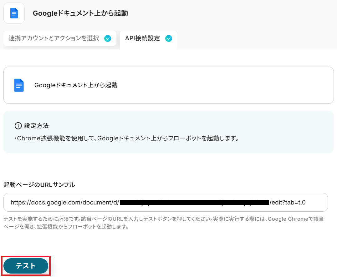 最後に起動ページのURLサンプル を入力してテストしましょう。 ※この設定はテストを実行するためのものです。実際の運用ではGoogle Chromeで該当ページを開き、拡張機能からYoomのフローボットを起動します。
