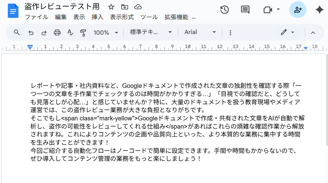ステップ3:Chrome拡張機能トリガーの設定 まず準備として、Googleドキュメントでテスト用の文章をご用意ください。