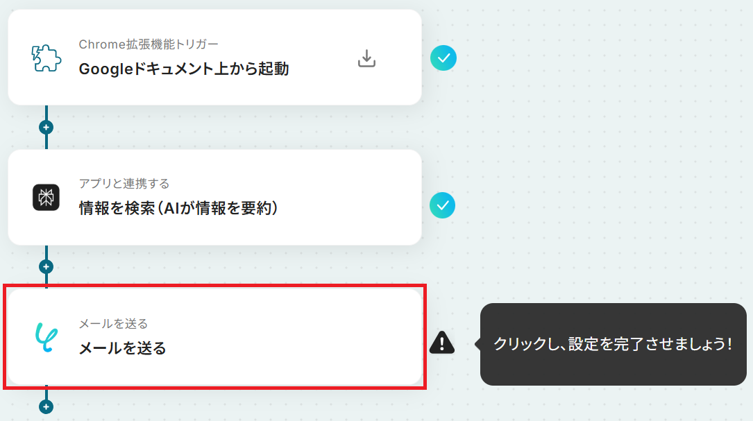 はじめに、GoogleドキュメントとPerplexityをYoomと連携します。 次に、トリガーでChrome拡張機能トリガーを選択し、Googleドキュメントのページ上でフローボットを起動できるように設定します。 次に、オペレーションでPerplexityの「情報を検索」アクションを設定し、Googleドキュメントのテキスト内容を解析するように指示します。 最後に、「メールを送る」オペレーションを設定し、Perplexityによる解析結果を指定した宛先にメールで自動送信します。 ※「トリガー」:フロー起動のきっかけとなるアクション、「オペレーション」:トリガー起動後、フロー内で処理を行うアクション■このワークフローのカスタムポイント